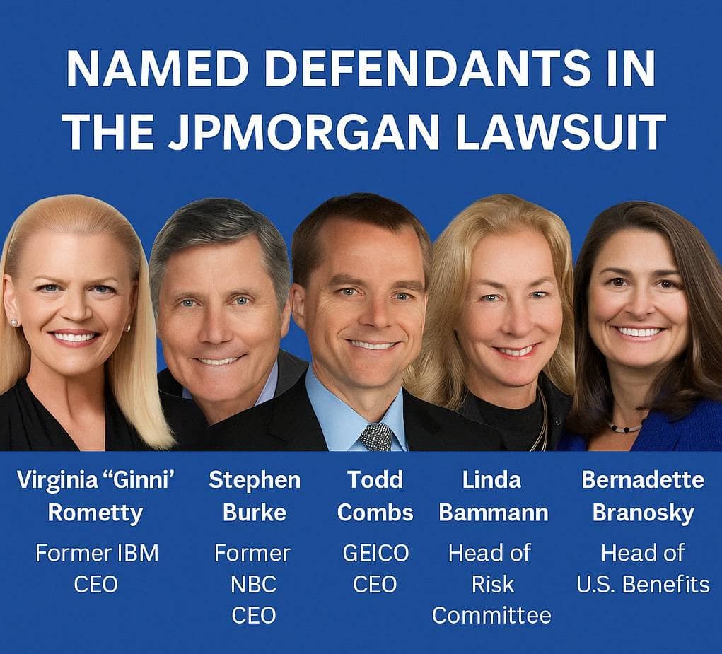The defendants in this case are notable: Virginia “Ginni” Rometty (former IBM CEO), Stephen Burke (former NBC CEO), Todd Combs (GEICO CEO), Linda Bammann (Head of Risk Committee), and Bernadette Branosky (Head of US Benefits).