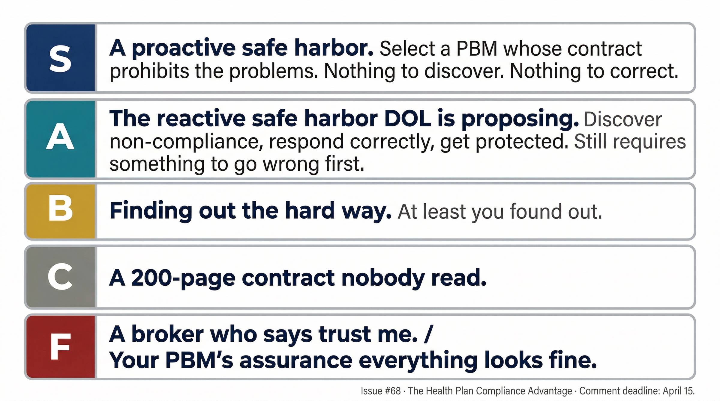 The comment period doesn’t close until April 15. That’s enough time to put the proactive safe harbor argument on the record. It’s enough time to document what your organization has experienced trying to get transparency from your PBM. It’s enough time to ask the DOL to recognize what sophisticated plan fiduciaries are already doing.