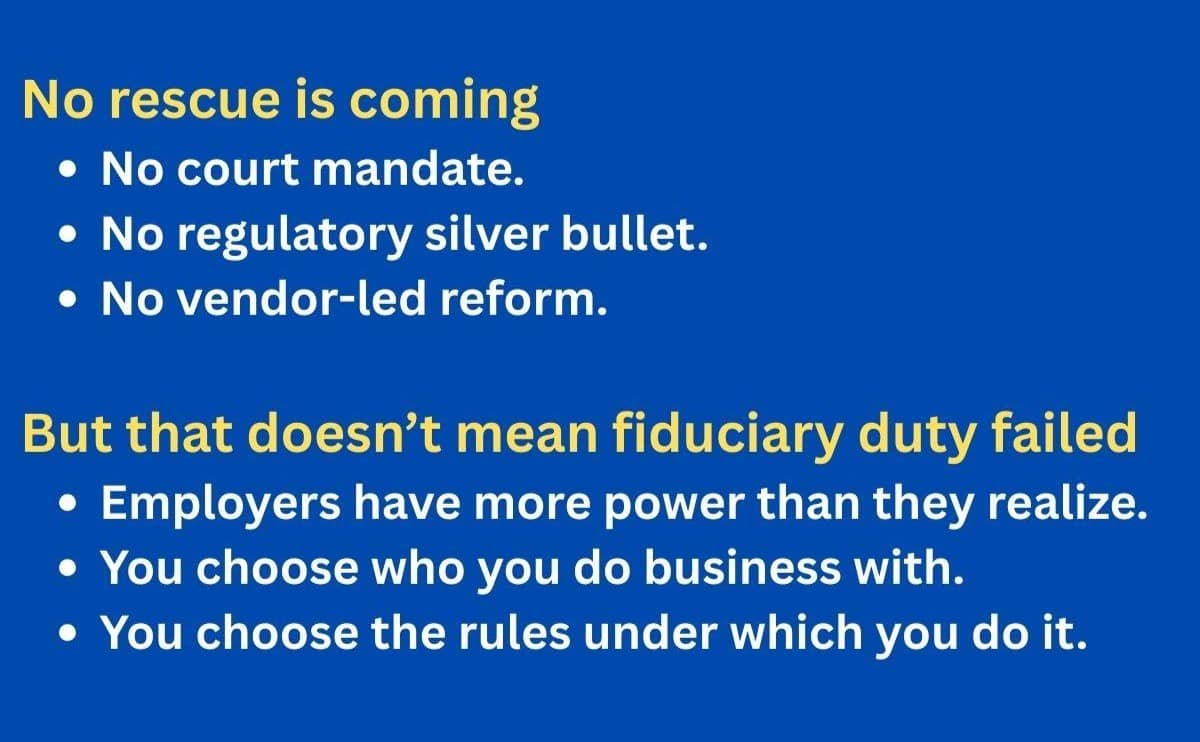 Conflicts are normalized. Brokers are still paid by vendors they choose and oversee. PBMs are still profiting from opacity. Fiduciary duties are still treated like administrivia instead of accountability.